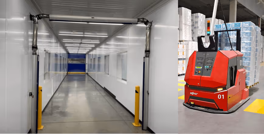 Each of Sonic's 50 HP (37.5 kW) centrifugal blower-Blower powered Ion-Air Static Control Air Knife System is designed to provide a high air velocity static neutral air curtain knife to remove all dust and small particles. As the tugger operator moves the pallets through the air tunnel zones, it doesn’t dislodge any of the items from the pallet, and it prevents contamination as it moves to a clean room area of the production floor through an 8 ft (2.4 m) H x 8 ft (2.4 m) W tunnel.