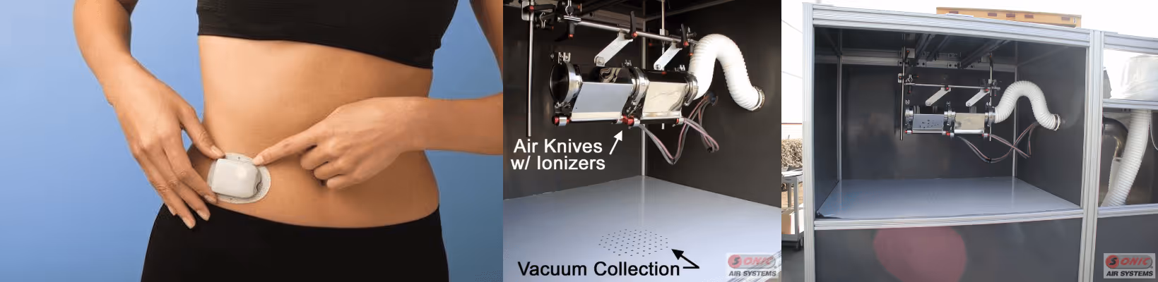 A major medical device maker was developing a wearable insulin pump and required a Class 100-rated air blow-off system to enhance the cleanliness of some intricate components prior to the pump assembly process. The requirement was to "air wash" their components of any dust or contaminants.