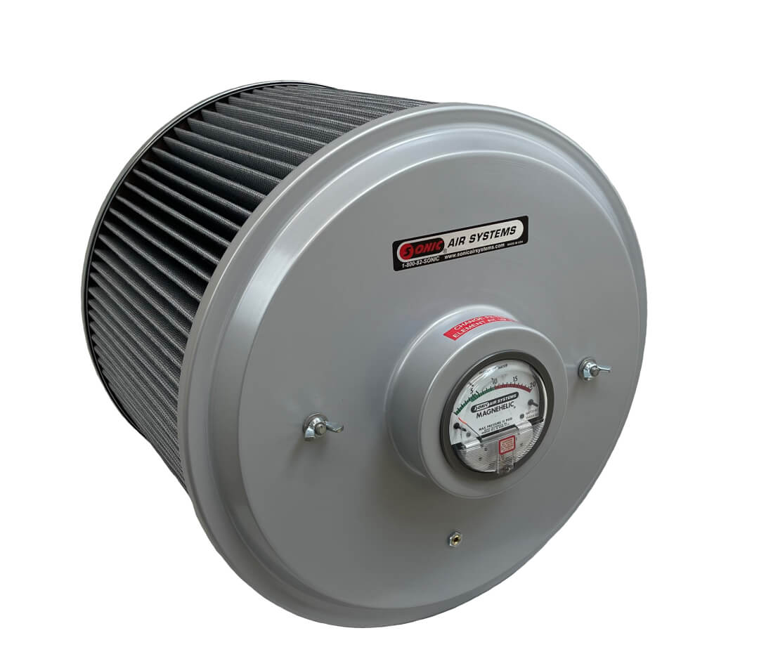Sonic offers over a dozen filter assembly designs to maximize the performance of your air blower and air knife systems. These are the most compact and quiet filter/silencer assemblies with filter cap mounted analog vacuum gage for superior predictive maintenance. With plated paper or washable polyester cartridges, they are rated up to 3500 CFM.